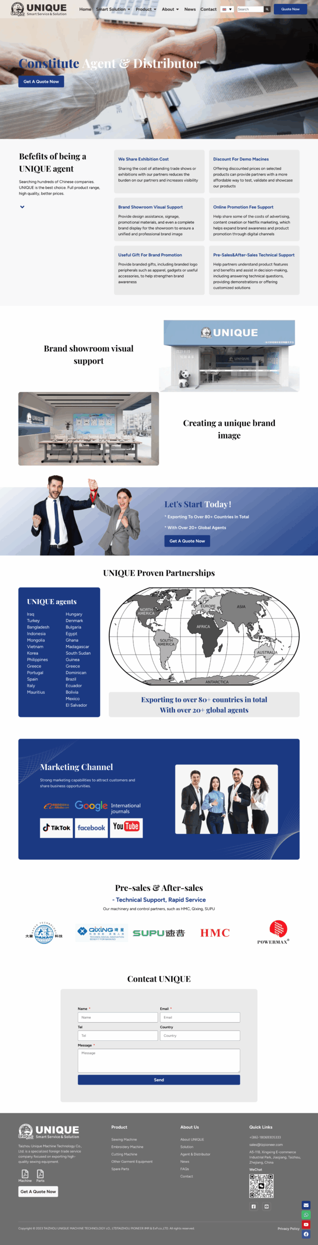 依托 20 余年的机械设备出口经验,领先进出口不断通过专业化服务与持续创新,形成了自身差异化竞争优势。目前,UNIQUE 已建立覆盖多国的代理与合作网络,专注整合设备资源、出口服务与市场需求,为全球客户提供可靠、高效的缝制设备出口解决方案,助力客户稳步拓展国际市场。